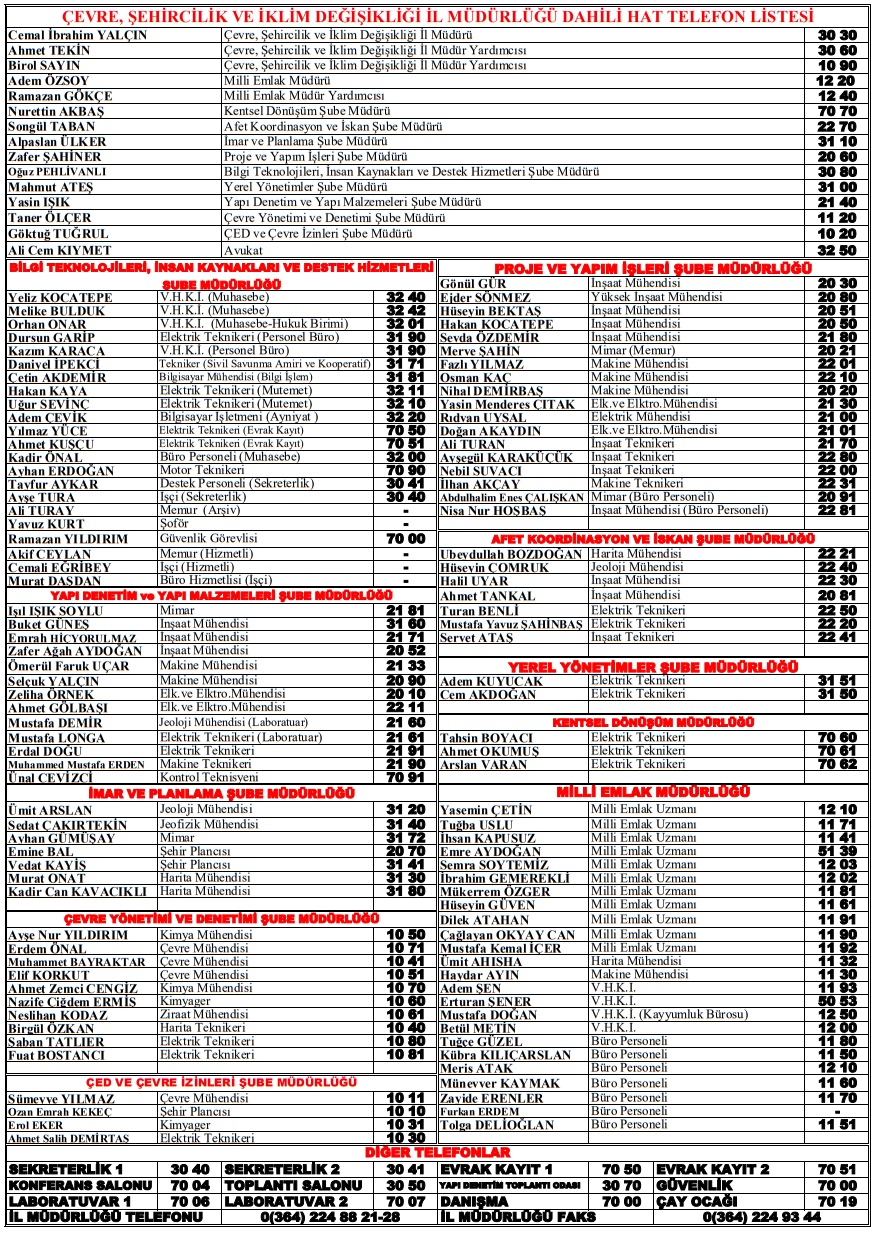 Personel Dahili Hat Telefon Listesi